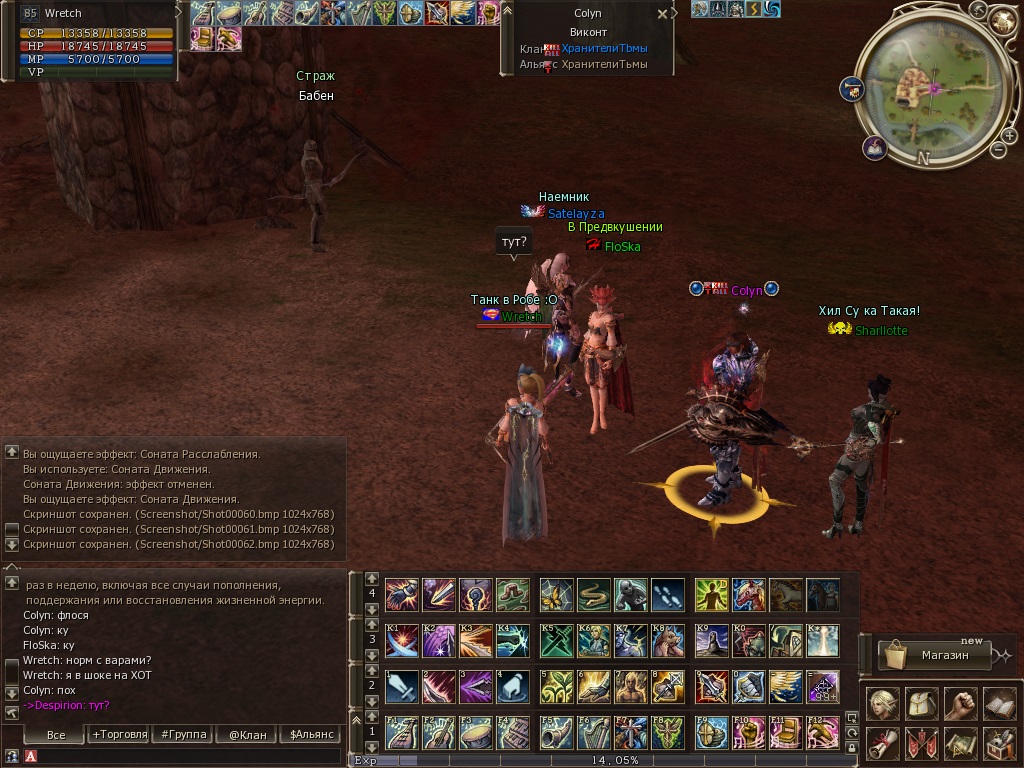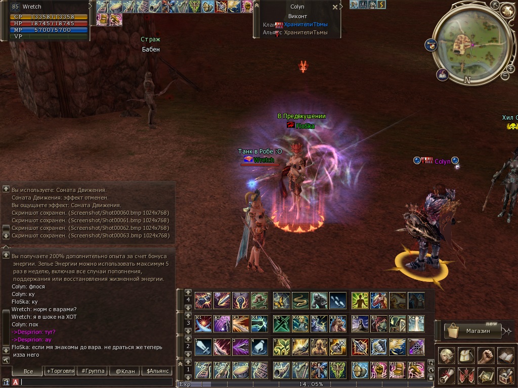 Гиза, я думаю, многие посмеются над этими скринами, так как ни на одном нет членов клана с варами вне мирной зоны. Правила клана это не запрещают. Интересно, кем же вы так обижены, что выкладываете тут жалкие попытки настукачить?)